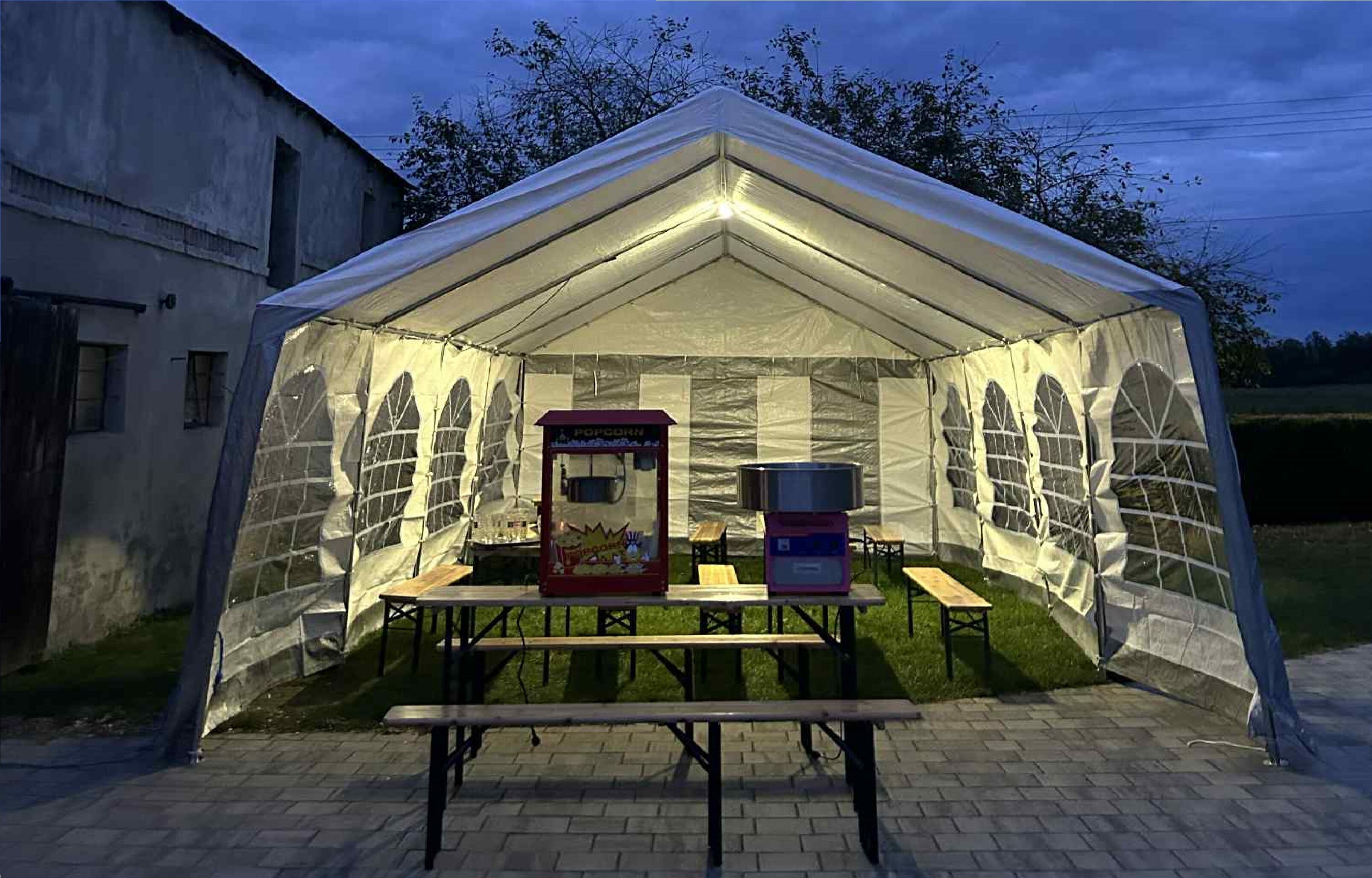 ⛺ Namiot festynowy 8x4m 🎉Przestronny i solidny namiot, idealny na każdą imprezę plenerową! Zmieści około 40 osób, a w komplecie znajdują się wygodne zestawy biesiadne (stoły + ławki). Doskonałe rozwiązanie na komunie, urodziny, festyny, wesela czy spotkania rodzinne.